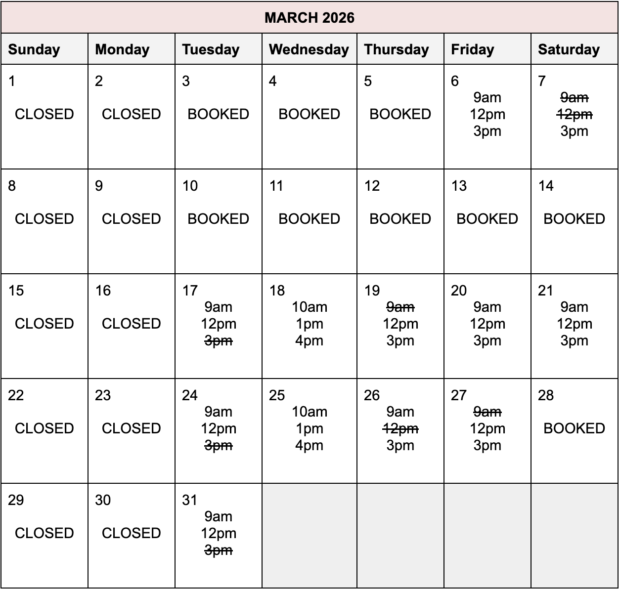 (Updated 3/5/2026. Please message on Instagram if you need the most up to date openings.)